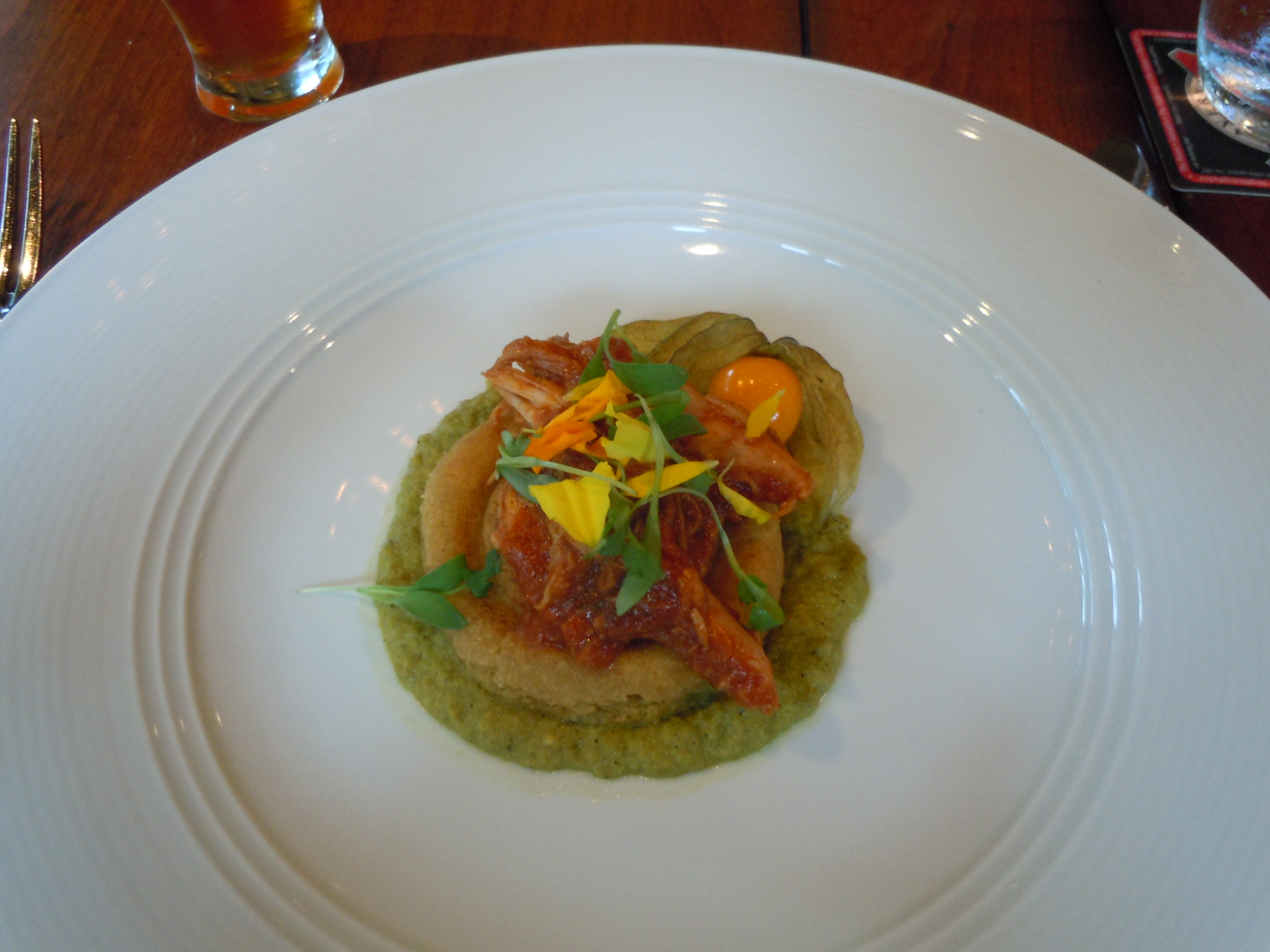 Tasting notes: The tangy, hoppy-verging-on-bitter Imperial IPA provided a good counterbalance for the Indian-reminiscent spiced pulled chicken. The corn pancake was sitting on a tasty, cooling green salsa that didn’t aggravate the palate, which can happen with spicy food and IPAs.