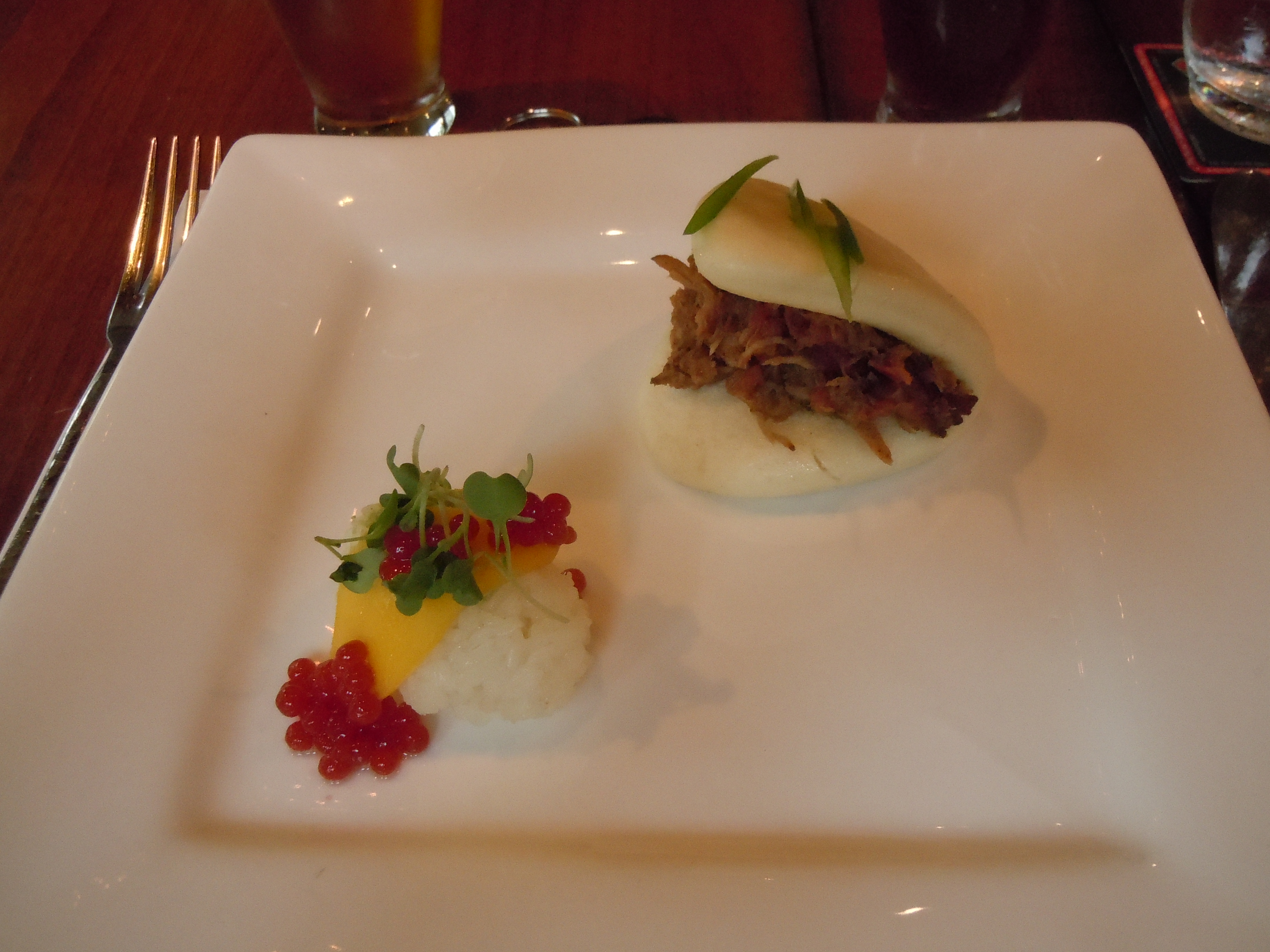 Mango Nigiri with Strawberry Caviar and Braised Pork and Lop Chung Steamed Buns