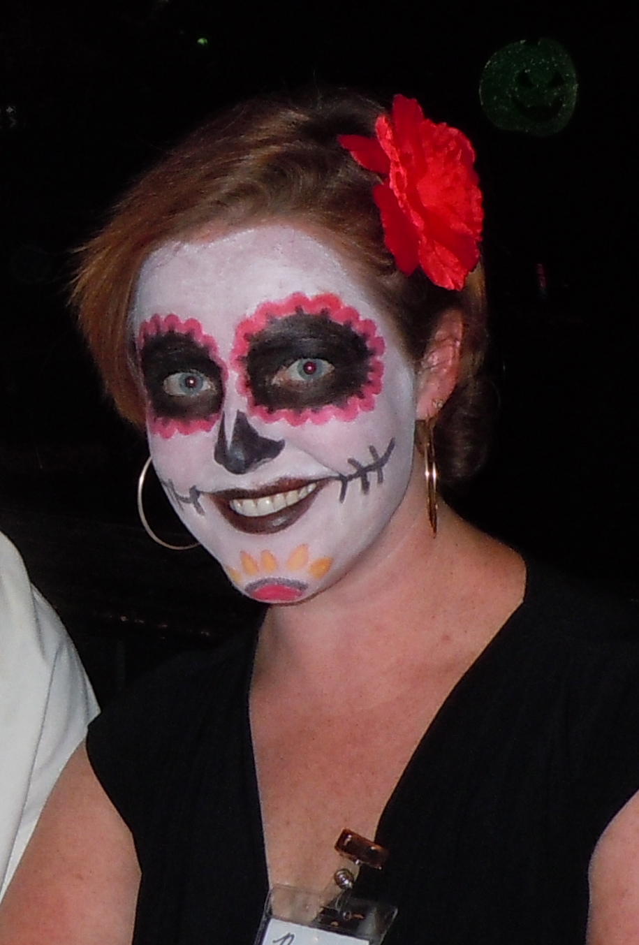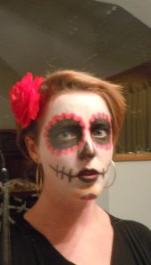 This is, for all intents and purposes, an easy costume. I wore a dress and flower I already owned; the most labor-intensive part was applying the makeup. I’d imagine that more professional supplies create an even better effect, but I created the below look with a pack of makeup crayons from WalMart. Price = $1.98.