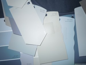 • As many different gray paint samples as you can get your hands on. I made trips to Home Depot, Sherwin Williams and WalMart and gathered as many as I could. I didn’t know how many it would actually take, but I’d rather be prepared.