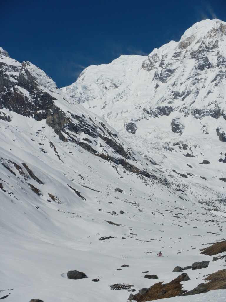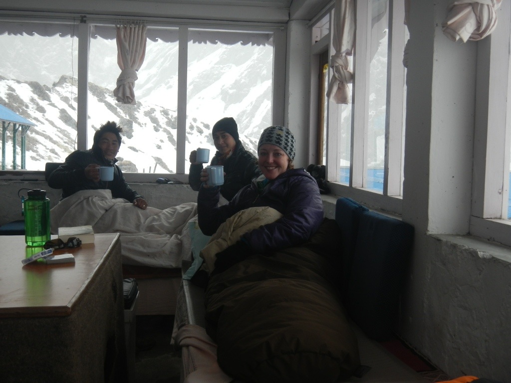 We push up to Machhapuchhre Base Camp (MBC) the next morning. It’s only about a two hour walk, but after a nice area next to the river, we’re crossing an avalanche track and then up on the moraine. It’s still snow covered, mushy in spots and icy in others, making traction difficult in addition to the gain in altitude. The clouds descend quickly, bringing the first snowflakes. I’m relieved to finally get to our tea house and bundle in my sleeping bag, wearing almost every piece of clothing that I brought. Everything up here, as with every tea house, was brought up on the back of a porter, an amazing feat when I see the Western style toilet. For the rest of the afternoon I watch the snow flurry outside, thankful for hot drinks and the restful acts of reading, dun bohl and napping.