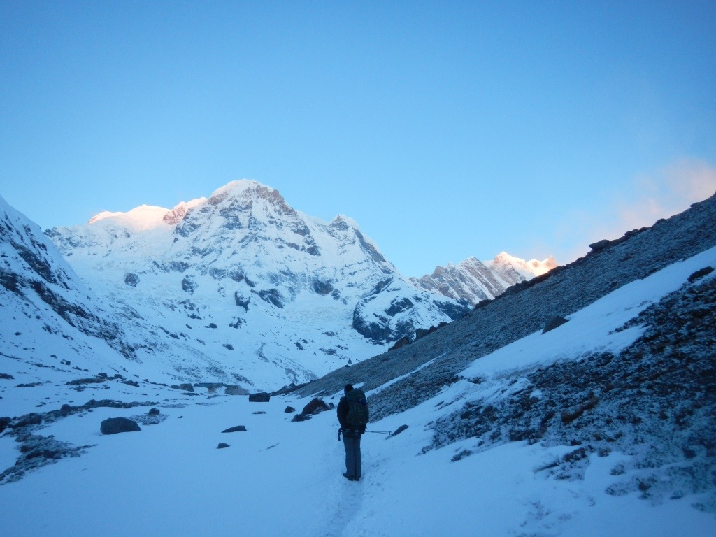 With the weather as it is seeing sunset on Annapurna is impossible, so we plan to catch the sunrise with a 4:30 a.m. departure. Dan rises early to check the weather; it’s clear and cold and we’re on the trail at 4:40 a.m. It’s a surreal experience, crunching up the snow with a headlamp, following the few other lights that trek silently before you. The mountains are visible mostly by the negative they create against the stars, which seem almost touchable. It’s cold, but I quickly grow warm and concentrate on each step over rocks and bits of tundra, keeping to the path that was tramped the previous day. We’re the only ones heading to ABC this morning.