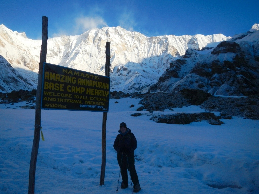 The light comes so gradually that it takes me a while to realize that I don’t need my headlamp anymore. The few tea houses at Annapurna Base Camp are like a mirage; we see the blue roofs early, but it seems to take forever to reach them. First light touches the range, turning it a beautiful peachy gold as we reach the sign welcoming trekkers to ABC. Even as I was getting closer, it didn’t seem quite real, that I would be looking over the Himalayas from this vantage point.