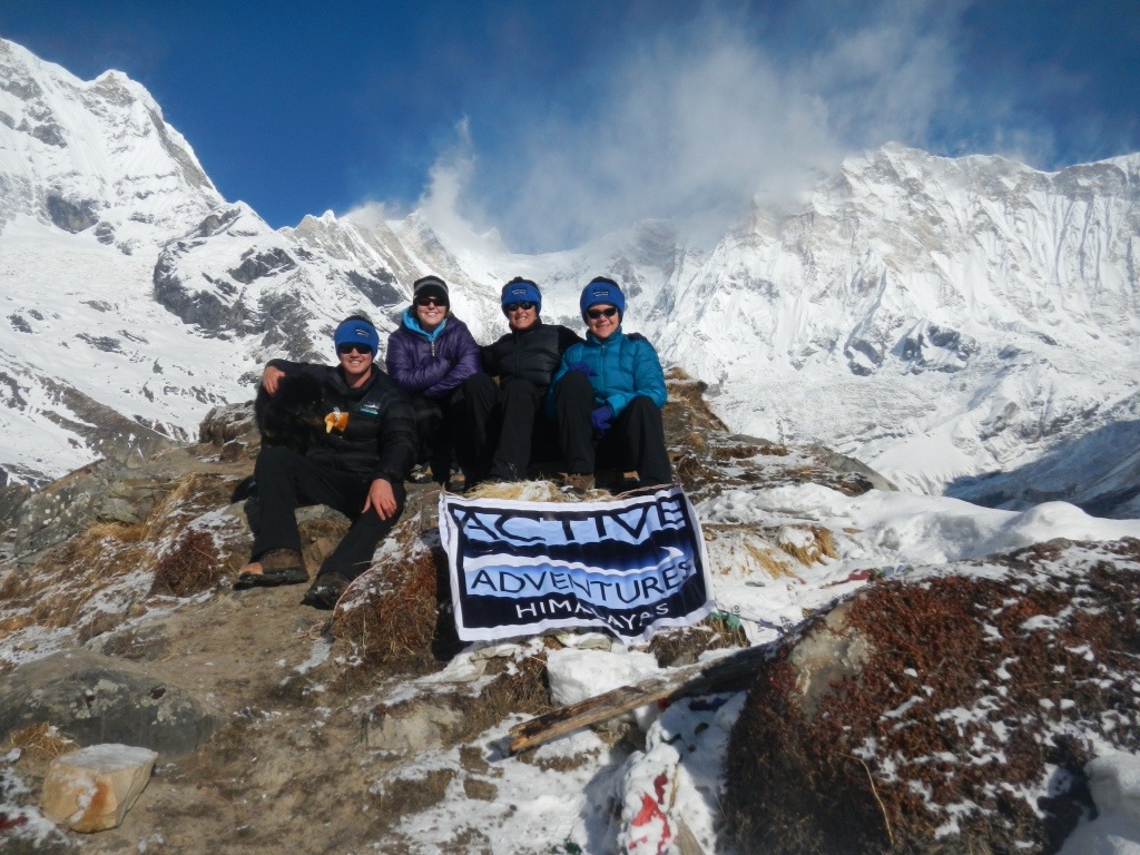 We warm up with tea and breakfast at one of the tea houses at Base Camp, chatting with other folks who spent the previous night there. Some photos for prosperity (complete with one of the dogs who trot up and down the mountain at their whim posing with us), a bit of gawking at a helicopter that has arrived to take some French skiers up for a few turns, and we head back down to MBC in the sun, shedding layers as we go.